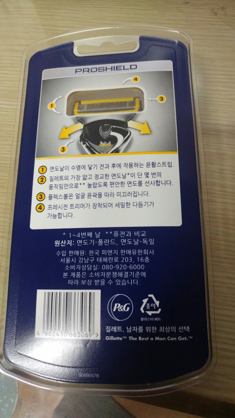 질레트 면도기 면도날 퓨전 프로쉴드 옐로우의 원산지는 독일제다.