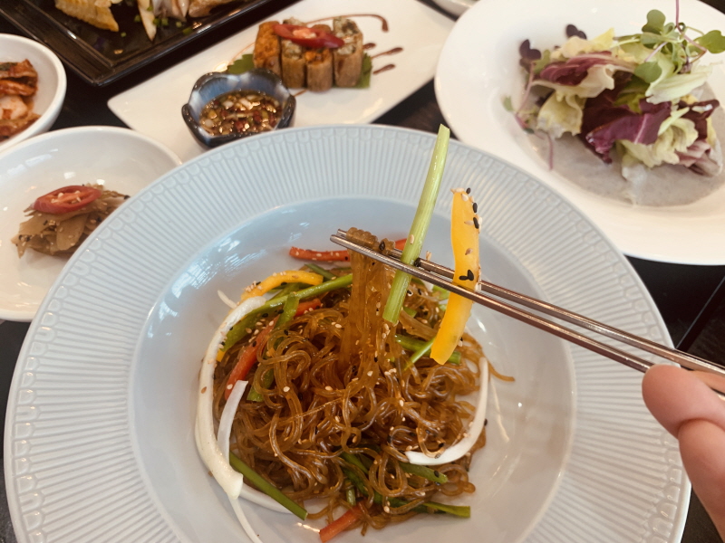 샐러드와 쌈채, 김치, 숙주무침, 문어샐러드, 잡채 등