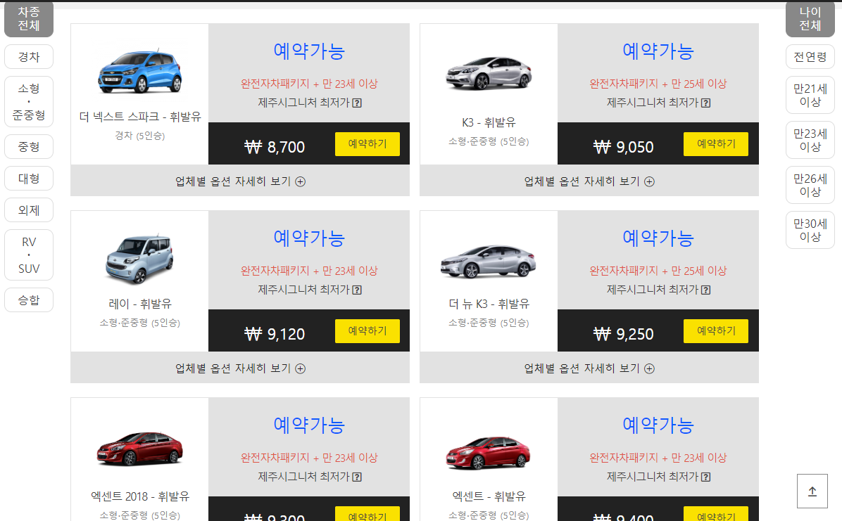 일정을 검색하고 예약을 누르면 바로 차종별 최저가가 확인이 가능해요.