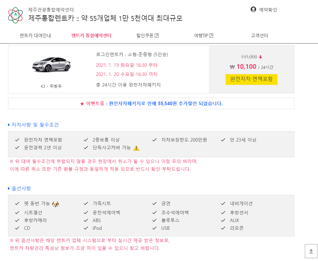 예약시 차량의 옵션사항과 대여조건도 안내해줘서 간편하죠.