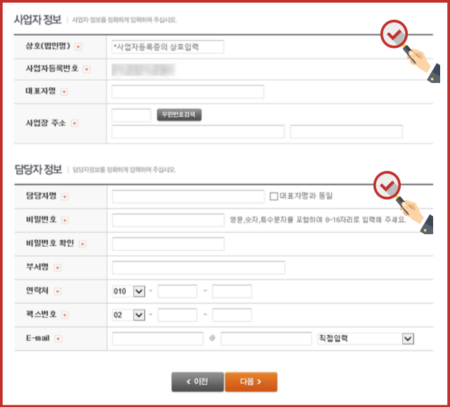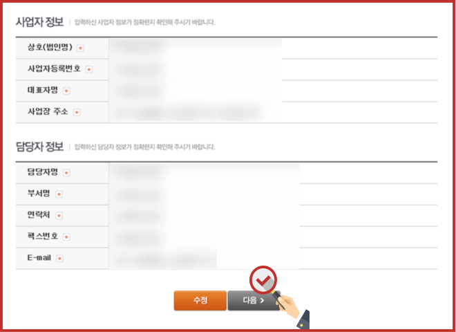 입력한 사업자&담당자 정보가 정확한지 확인합니다.