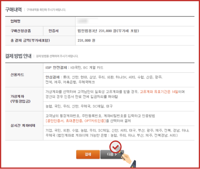 결제가 끝난 뒤에는 다음을 눌러 인증서 신청서를 출력해주세요.