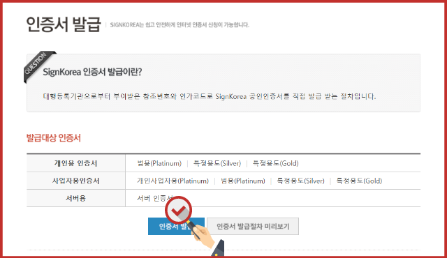 [인증서 발급받기] 버튼을 클릭하면 인증서 발급절차가 진행됩니다.